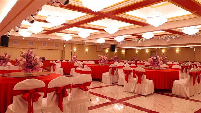 皇宮廳—金碧輝煌、皇宮式裝修,面積1038㎡,層高8.6米,配備愛情階梯、軌道威亞、二層觀禮臺、浪漫燈光秀、旋轉升降舞臺、頭頂天幕連接開合大屏。可承接50桌的大型宴會,也可舉辦600人的大型會議;還可用作會展、車展場地,每逢節假日還為市民上演文藝節目。